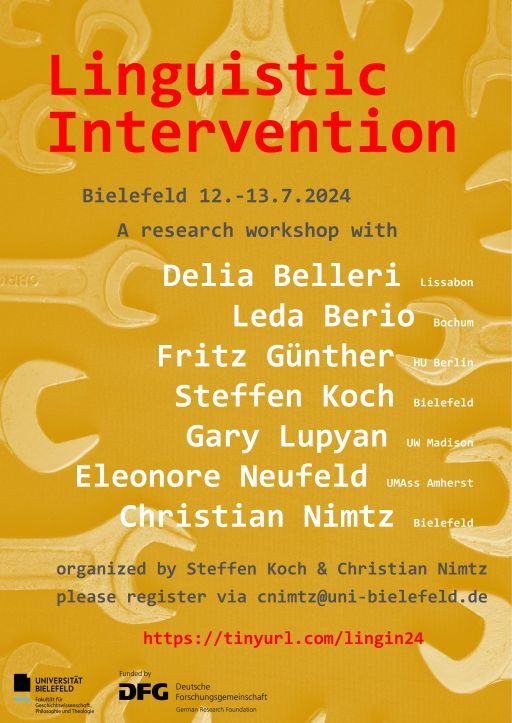 Confirmed speakers: Delia Belleri (Lisbon), Leda Berio (Bochum), Fritz Günther (HU Berlin), Steffen Koch (Bielefeld), Gary Lupyan (Wisconsin-Madison), Eleonore Neufeld (UMass Amherst), and Christian Nimtz (Bielefeld).